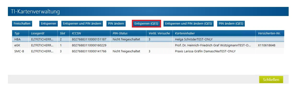 Wenn die PUK (QES) vorliegt, muss lediglich in der Praxissoftware der Hauptbereich „Einrichtung“ aufgerufen werden. Im Action Panel wird das Untermenü TI Kartenverwaltung ausgewählt. Im geöffneten Hinweisfenster klicken Anwenderinnen und Anwender auf die betreffende eHBA und anschließend auf den Button Entsperren (QES).