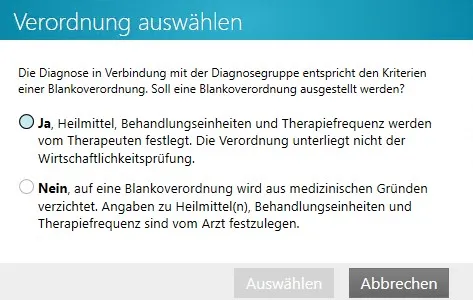 Dafür müssen Anwenderinnen und Anwender in der Praxissoftware medatixx eine Heilmittelverordnung auswählen und eine mögliche Kombination von ICD-10-Code und Diagnosegruppe eingeben. Daraufhin erscheint ein Dialog, in dem bestätigt wird, dass eine Blankoverordnung ausgestellt wird. Eine Liste von möglichen Diagnosen ist beispielsweise auf der Website der KBV oder des GKV-Spitzenverbandes zu finden.