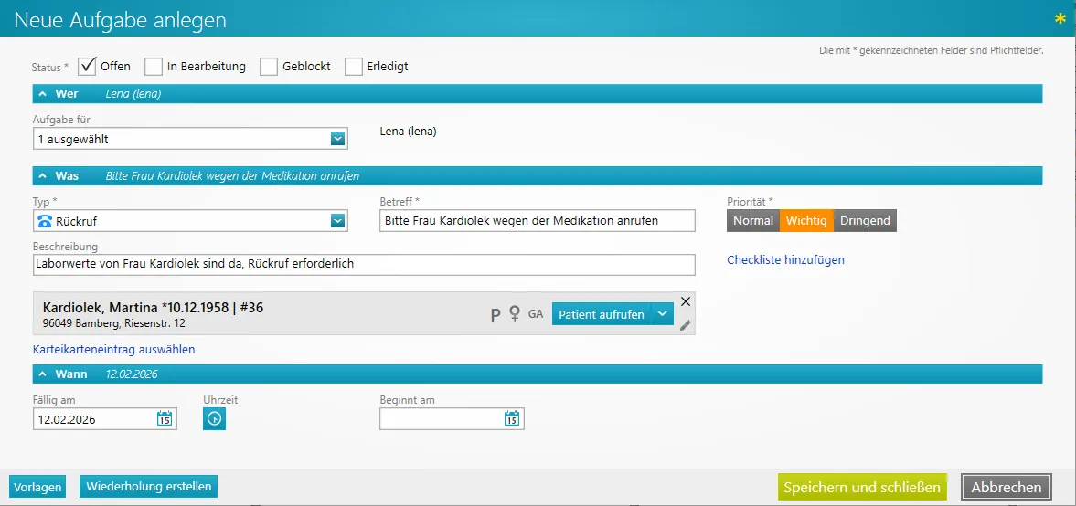 Die Laborwerte der Patientin Martina Kardiolek sind da. Dr. Doxx bittet Lena: „Bitte Frau Kardiolek wegen der Medikation anrufen.“ Lena legt innerhalb von Sekunden eine Aufgabe mithilfe der erstellten Aufgabenvorlage „Rückruf“ an, damit sie daran denkt. Der Arzt sieht später den Status, und Lena hat das Anliegen sicher auf ihrer Liste – kein Risiko, dass etwas in Zettelstapeln verschwindet und vergessen wird.