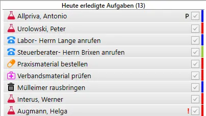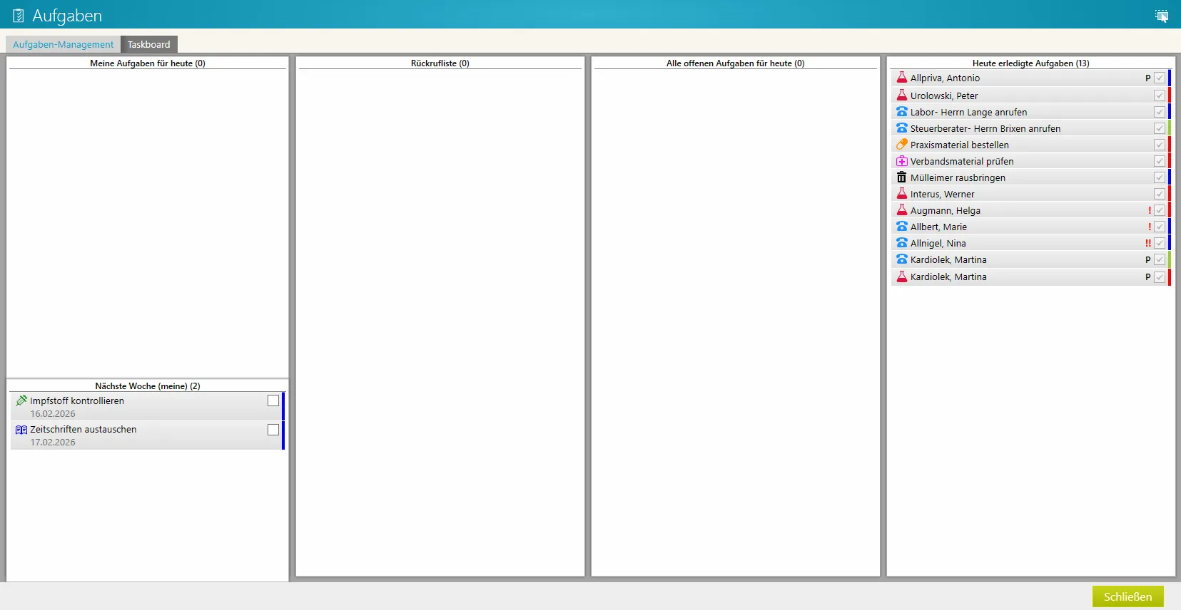Diese Aufgaben stehen nicht nur bei ihr, sondern im gesamten Team an – und das ganze Praxisteam sieht transparent, was zu tun ist. Gerade Routineaufgaben wie „Verbandsmaterial prüfen“ tauchen automatisiert am eingestellten Tag auf, sodass niemand sie vergisst. Jeder im Praxisteam kann den Bearbeitungs-Status und die Priorität der Aufgaben einzeln einstellen. So behalten Lena und das Team einen einfachen Überblick darüber, was heute noch zu tun ist und was bereits erledigt.