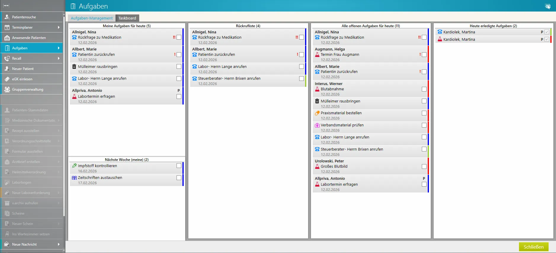 Während der Sprechstunde kommen ständig neue To-dos herein. Früher bedeutete das: Klebezettel, Zurufe und Chaos. Jetzt legt Lena Aufgaben direkt im System an – sichtbar für das gesamte Praxisteam. Wird z. B. ein Rezeptwunsch an den Arzt weitergegeben, erscheint er automatisch in seiner Aufgabenliste. Durch die klaren Spaltenstrukturen wird deutlich: Jede Aufgabe hat ihren Platz. Jeder sieht, was getan wurde oder noch aussteht. Das spart Abstimmung und verhindert Missverständnisse und Doppelarbeit.
