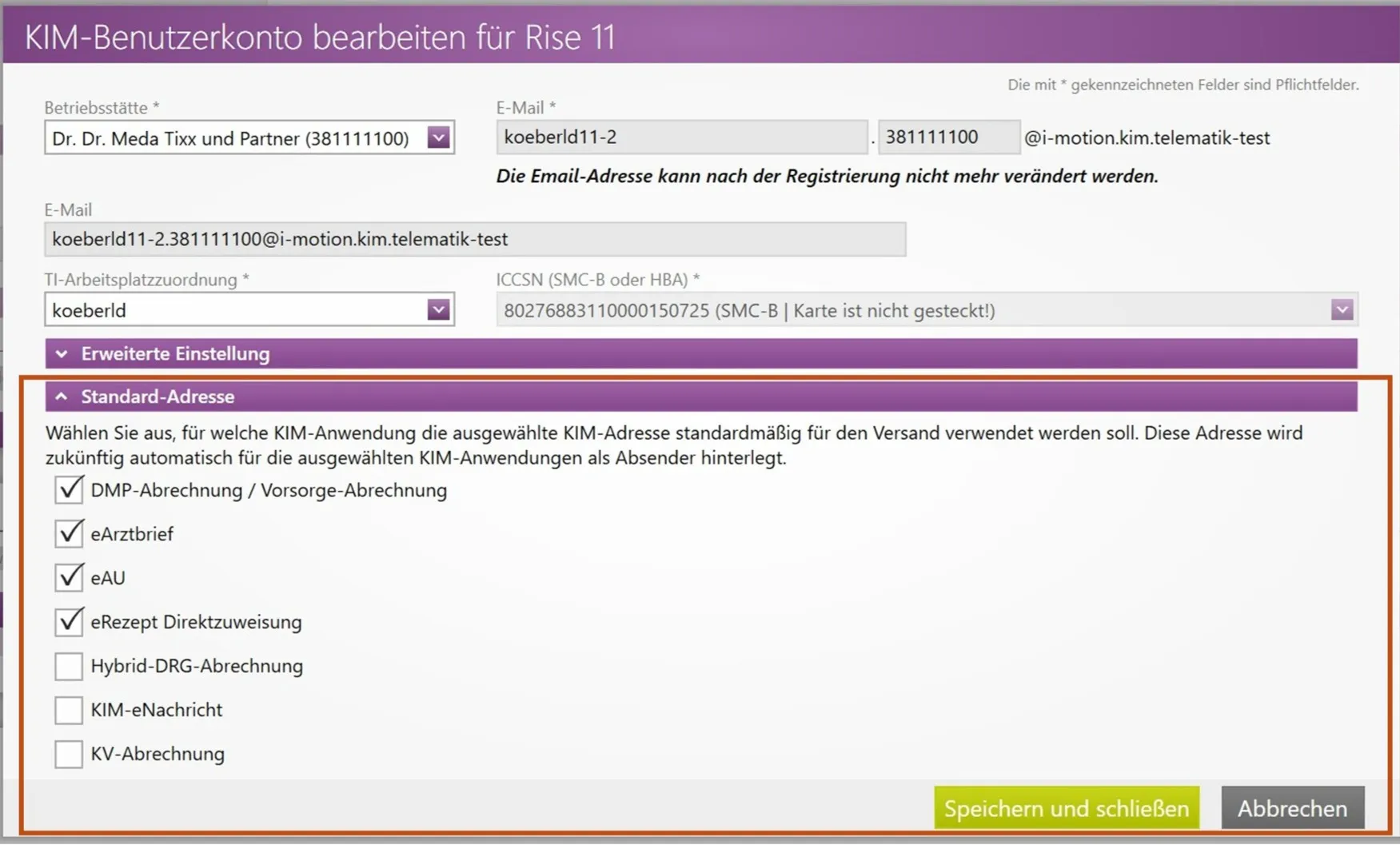 Die Kommunikation via KIM (Kommunikation im Medizinwesen) ist schon lange etabliert und spätestens seit der Abschaltung von KV-Connect nicht mehr aus dem Praxisalltag wegzudenken. Um die Abläufe rund um die Versendung von Abrechnungen, Arztbriefen und eAUs weiter zu vereinfachen, haben Sie in Ihrer Praxissoftware nun die Möglichkeit, Standardadressen für verschiedene Anwendungen zu hinterlegen. Dies sorgt für mehr Übersicht im täglichen Arbeitsprozess – insbesondere dann, wenn Sie über mehrere KIM-Adressen verfügen. Falls Sie nur eine KIM-Adresse haben, wird diese automatisch als Standardadresse hinterlegt.