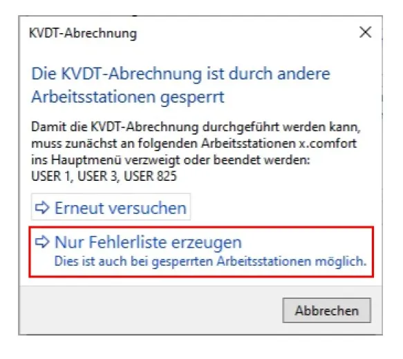 Die Fehlerliste lässt sich auch erzeugen, wenn andere Stationen aktiv sind. Starten Sie wie gewohnt die Probeabrechnung mit <F2 Start>. Bei Meldung wählen Sie “Nur Fehlerliste erzeugen” so kann an den anderen Stationen weitergearbeitet werden.