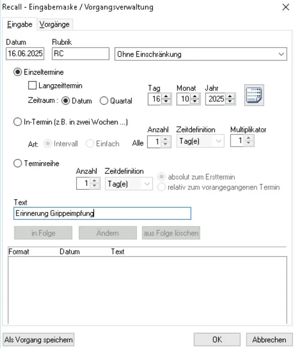 Die „Recall“-Funktion dient dazu, Patientinnen und Patienten automatisch an fällige Untersuchungen oder Kontrollen zu erinnern – beispielsweise Vorsorgeuntersuchungen oder wiederkehrende DMP-Vorstellungen.