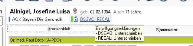 Für die Nutzung der Recall-Funktion ist eine Einwilligung der betroffenen Patientinnen und Patienten erforderlich. Diese kann in der Patientenzeile dokumentiert werden.