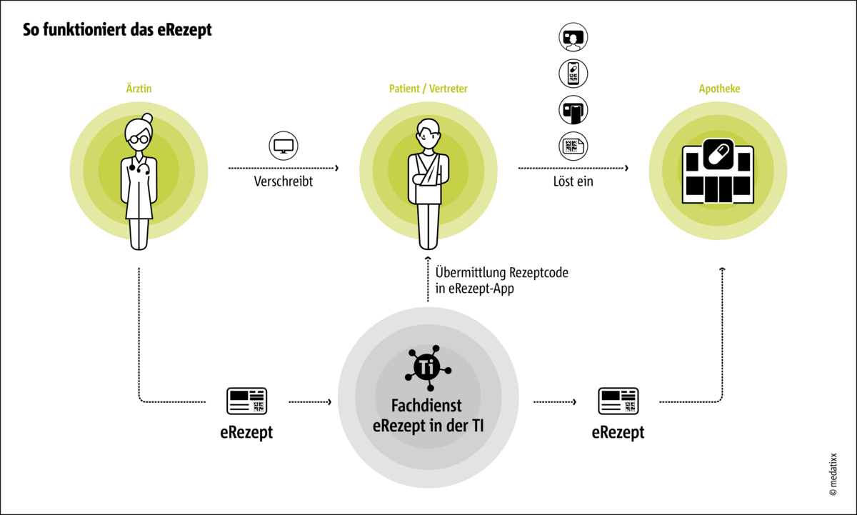 Mit dem eRezept werden Verordnungen in elektronischer statt in Papierform übermittelt. Dabei wird der gesamte Prozess von der Rezeptausstellung in der Arztpraxis bis hin zur Einlösung in der Apotheke digitalisiert. Die Einlösung des eRezepts ist über die elektronische Gesundheitskarte (eGK), die eRezept-App der gematik oder mittels Papierausdruck des Rezept-Codes (Stylesheet) möglich. Mit dem E-Health-CardLink-Verfahren steht ein weiterer Einlöseweg zur Verfügung.