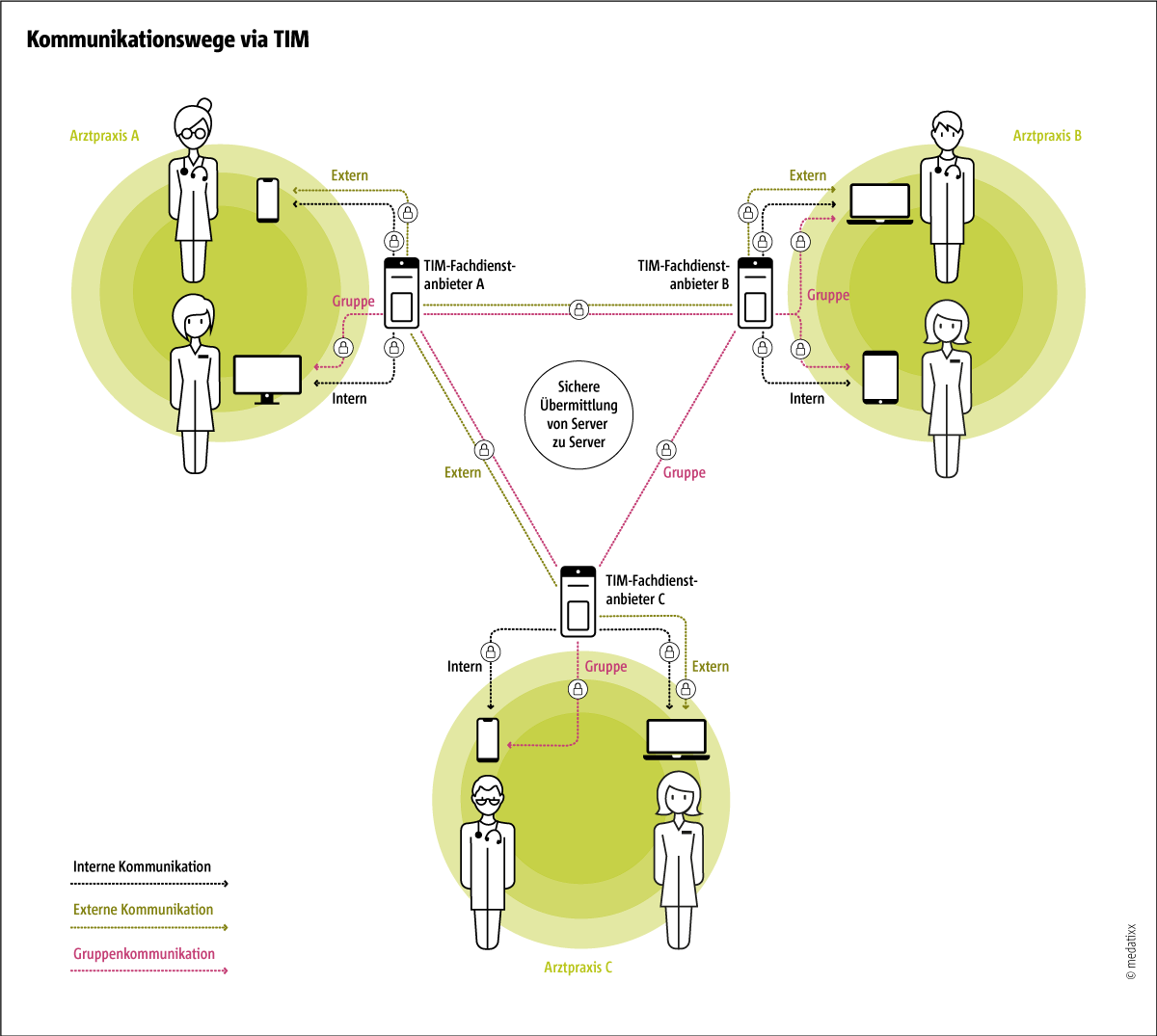 Mit TIM ist eine schnelle und niederschwellige Kommunikation zwischen verschiedenen Stakeholdern im Gesundheitswesen möglich. Die Kommunikation erfolgt dabei dezentral über die jeweiligen Fachdienste. Die betreffenden Server kommunizieren immer direkt miteinander, ohne Umwege. Die via TIM übertragenen Daten liegen somit ausschließlich beim jeweiligen Fachdienstanbieter. Jede Praxis kann dabei – analog zu KIM – den Fachdienstanbieter ihrer Wahl nutzen, da sämtliche TIM-Angebote miteinander interoperabel sind.
