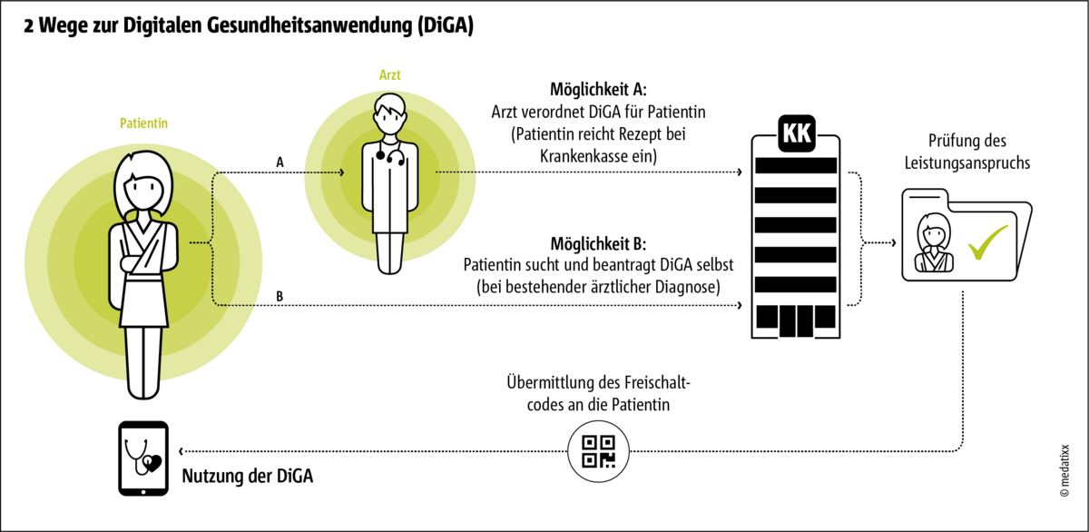 Grundsätzlich haben Patientinnen und Patienten zwei Möglichkeiten, eine DiGA zu erhalten, deren Kosten von der gesetzlichen Krankenkasse übernommen wird: entweder auf Rezept durch die behandelnde Ärztin oder den behandelnden Arzt beziehungsweise die behandelnde Psychotherapeutin oder den behandelnden Psychotherapeuten oder durch einen eigenen Antrag direkt bei ihrer Krankenkasse.
