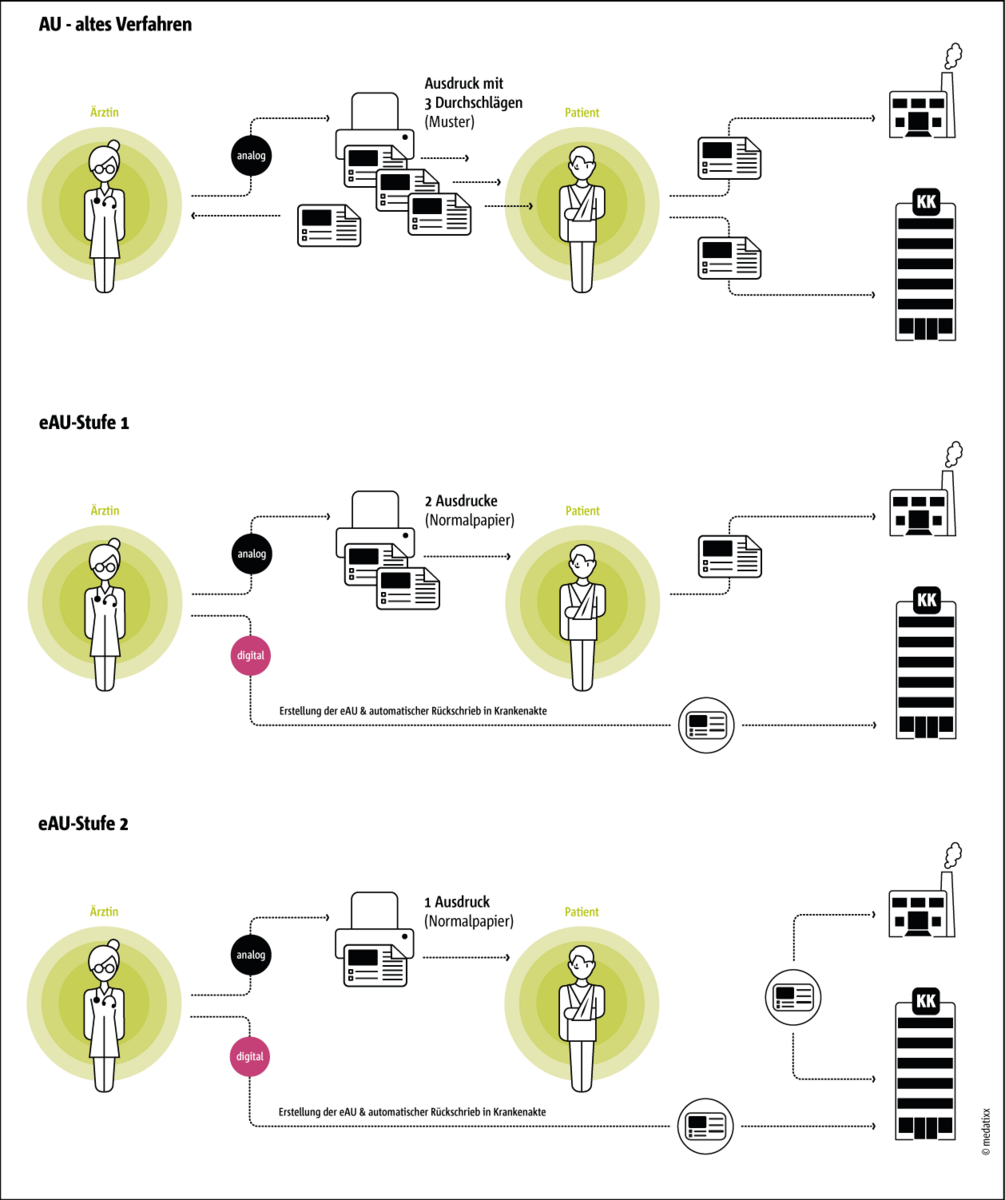 Die Arbeitsunfähigkeitsbescheinigung wird inzwischen elektronisch übermittelt und ist damit zur eAU geworden. Während früher mehrere "Durchschläge" auf Papier – dem "gelben Schein" – erstellt wurden erfolgt die Übermittlung an die Krankenkasse inzwischen digital. Von dort erfolgt der Abruf der AU durch den Arbeitgeber ebenfalls elektronisch. Lediglich die Ausfertigung für die Patientin oder den Patienten wird auf Papier ausgedruckt. Auf ausdrücklichen Wunsch der Patientin oder des Patienten kann auch die Ausfertigung für den Arbeitgeber zusätzlich ausgedruckt und unterschrieben mitgegeben werden.