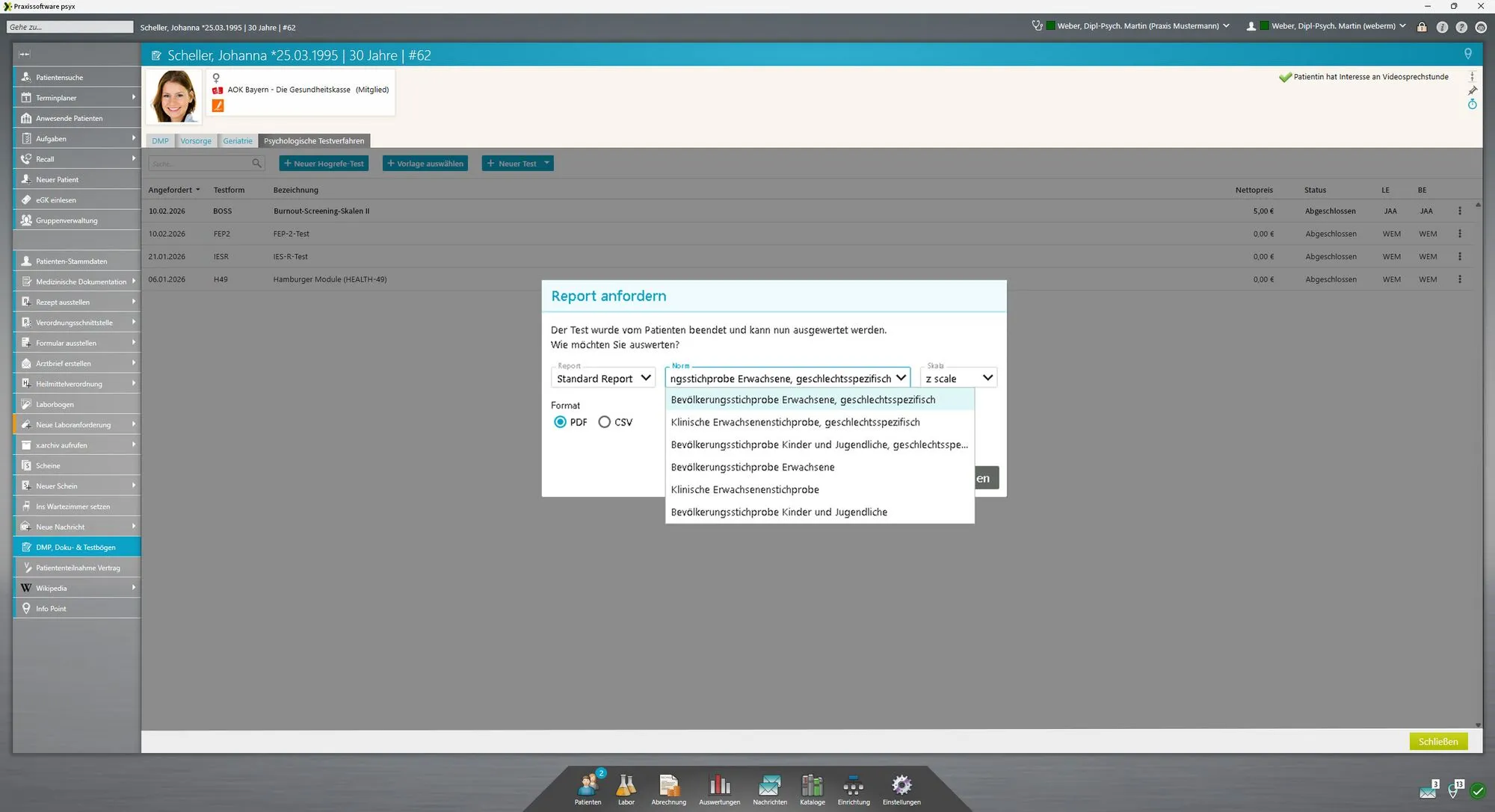Seit Herr Weber das Modul „Psychologische Testverfahren“ in der Praxissoftware psyx nutzt, läuft der gesamte Ablauf deutlich einfacher ab. „Früher musste ich Papierformulare nachbestellen, händisch auswerten und alles manuell übertragen“, erzählt Herr Weber. „Heute wähle ich das passende Verfahren einfach im Modul aus – und der Rest passiert fast automatisch.“