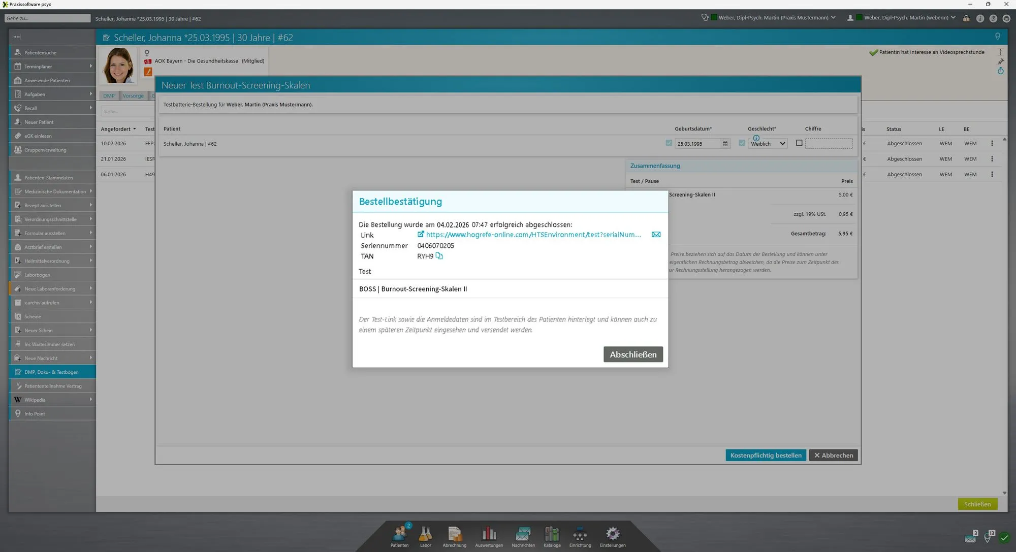 Mit einem Klick auf das Mail-Symbol (Briefumschlag) sendet er Johanna den individuellen Link per E-Mail zu. Voraussetzung hierfür ist ein eingerichtetes E-Mail-Programm auf dem Praxis-PC. Den Test startet Johanna über den Webplayer des Kooperationspartners Hogrefe, nachdem sie die automatisch generierte TAN eingegeben hat.