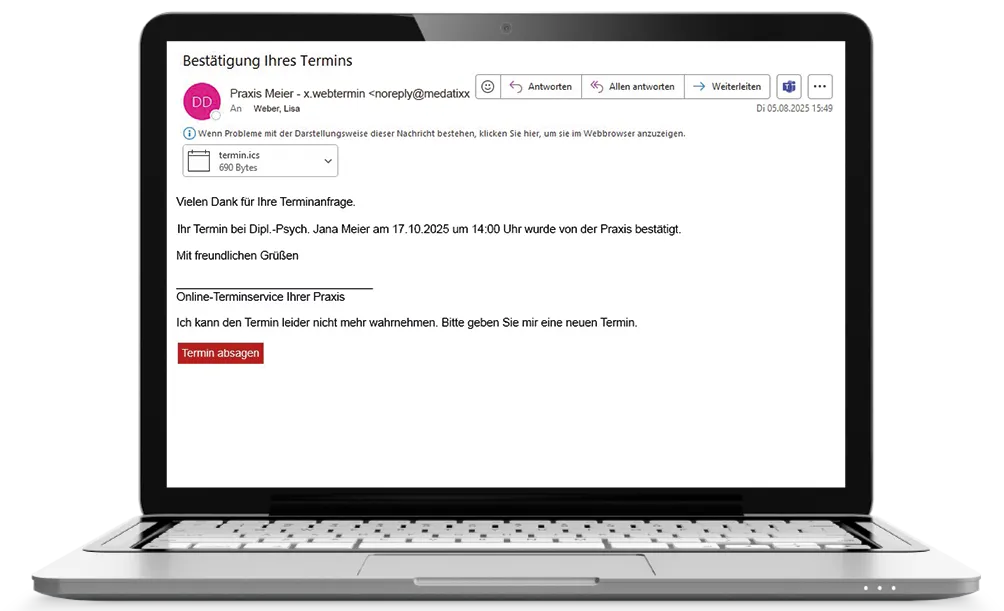 Wenig später erhält Frau Weber die offizielle Terminbestätigung, inklusive einer ICS-Datei, die sie mit nur einem Klick in ihren Kalender übernimmt. Damit der Termin in ihrer Gedankenflut nicht untergeht, hat Frau Weber bei der Buchung zusätzlich die Erinnerungsfunktion aktiviert. So sendet x.webtermin am Vortag automatisch eine E-Mail-Erinnerung – das fördert nicht nur die Termintreue, sondern ist auch für Frau Weber ein nützlicher Reminder.