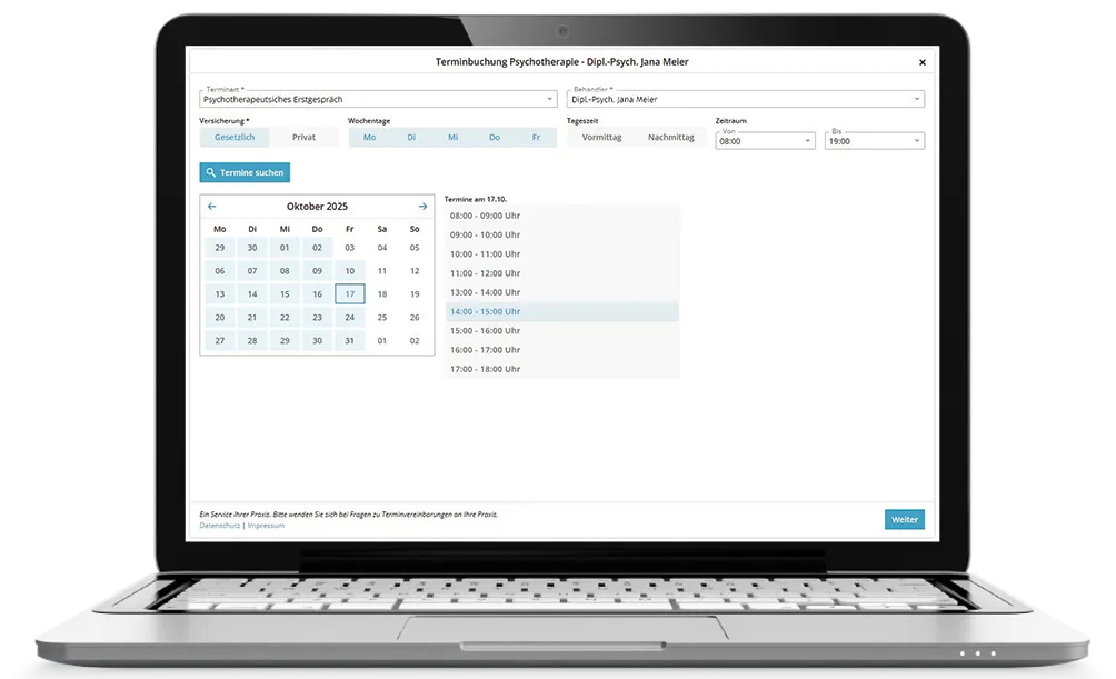 Dort klickt sie auf „Termin buchen“ und wird automatisch zum Terminfenster der Praxiswebsite weitergeleitet, das mithilfe von x.webtermin erstellt wurde. Sie wählt die Terminart „Psychotherapeutisches Erstgespräch“ aus. Sofort erscheinen passende freie Zeitfenster, aus denen sie sich den kommenden Freitag um 14 Uhr aussucht. Kurz darauf erhält Frau Weber per E-Mail einen Bestätigungslink, über den sie den Termin annimmt. Gleichzeitig geht die Anfrage an die Praxis von Jana Meier, die den Termin freigibt – sie schätzt besonders, dass sie jederzeit die volle Kontrolle über die Terminvergabe behält.