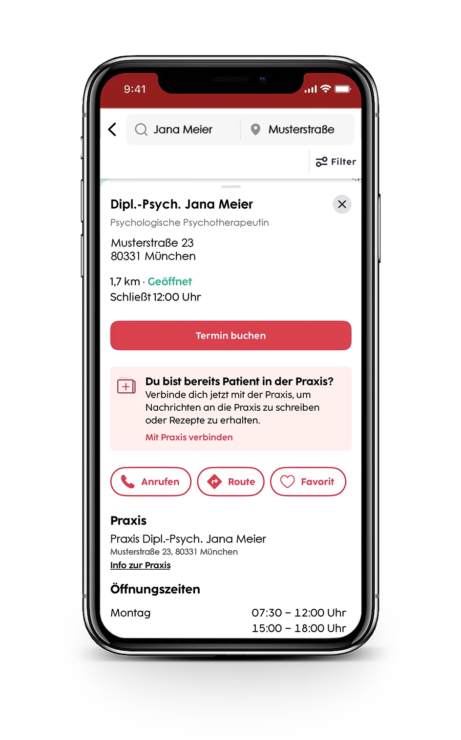 Auf der Suche nach Unterstützung greift Frau Weber zur gesund.de App. Eine Bekannte hat ihr die Dipl.-Psych. Jana Meier, Psychologische Psychotherapeutin in München, empfohlen. Über die Suche gibt Frau Weber den Namen sowie weitere Standortinformationen ein und gelangt direkt zum Praxisprofil. Dieses liefert ihr auf einen Blick alle wichtigen Informationen.