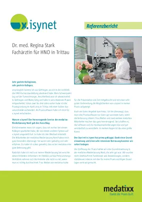 Vor Eröffnung der Praxis hatten wir eine Grundeinweisung in der medatixx-Niederlassung Nord, die sehr gut war. Wir wurden nicht überhäuft mit Funktionen und Anwendungen, sondern stattdessen intensiv mit den für meine Praxis wichtigen Grundlagen vertraut gemacht. Die Wege zu medatixx sind kurz – auch und besonders vor Ort. Das wissen meine beiden Mitarbeiterinnen und ich zu schätzen. In den beiden ersten Tagen nach der Praxiseröffnung war Herr Lienau in der Praxis, sodass er meinen Mitarbeiterinnen sofort bei allen Fragen helfen konnte. Eine der beiden war damals ganz neu im Beruf, die andere war zuvor noch nie in einer HNO-Praxis tätig gewesen und hatte vorher mit einem anderen System gearbeitet. Ab dem dritten Tag haben wir jeden Mittag Fragen gesammelt und diese dann mit unserem medatixx-Betreuer besprochen. Was noch fehlte, war eine DFÜ, zum Beispiel für die Labordatenübertragung. Anfangs hatte auch das Hörgeräteformular ein wenig gehangen. Da wir dies nicht täglich aufrufen, ist uns das erst später aufgefallen. Aber auch diese Probleme wurden rasch gelöst, so dass nach kürzester Zeit alles perfekt lief. Anfang Juli hatten wir ein Treffen mit unserem medatixx-Betreuer für die Abrechnung. Er hatte mich eigeninitiativ angerufen und wollte wissen, ob ich Fragen dazu hätte. Das fand ich sehr gut und so habe ich den Service gerne angenommen. Bis dahin hatte ich noch nie etwas mit der Abrechnung zu tun. Doch auch diese wird einem in x.isynet leicht gemacht und lief ohne Probleme. Für das Einspielen des ersten Updates haben wir auch schon einen Termin vereinbart.