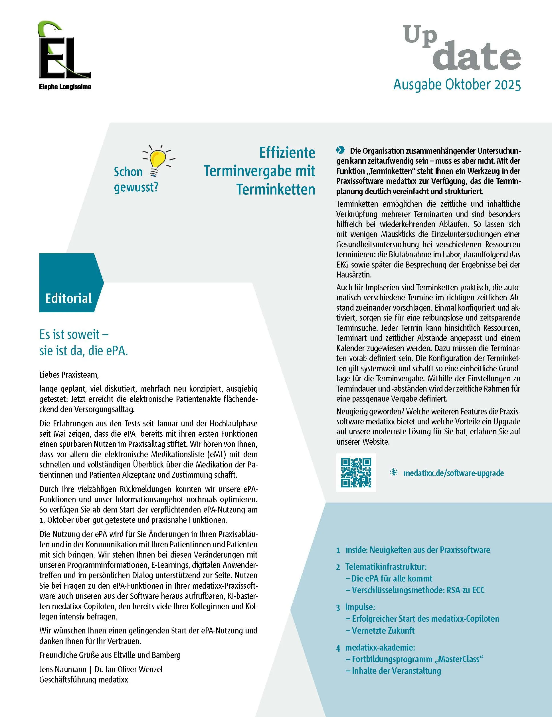 Die neueste Ausgabe unseres x.press-Updates ist da! Wir informieren Sie über aktuelle Neuigkeiten aus Ihrer Praxissoftware und stellen Ihnen mit dem medatixx-Copiloten und dem medatixx-HealthHub zwei spannende neue Anwendungen vor. Außerdem weisen wir auf unser umfangreiches Informationsangebot zur ePA für alle hin.