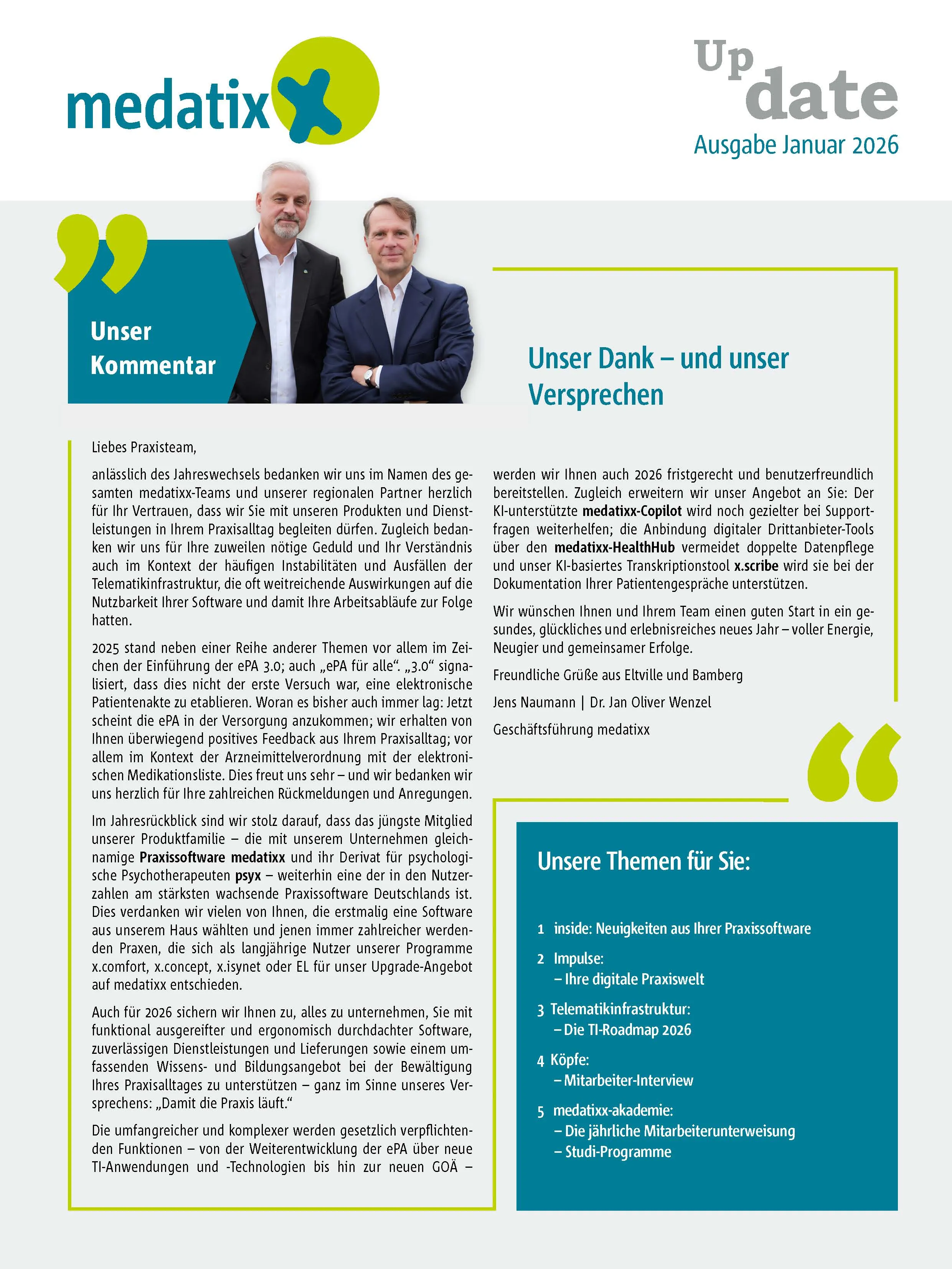 Die neueste Ausgabe unseres x.press-Updates ist da! Wir informieren Sie über aktuelle Neuigkeiten aus Ihrer Praxissoftware, geben Ihnen einen Überblick über die TI-Roadmap 2026 und stellen Ihnen aktuelle Angebote unserer medatixx-akademie vor.