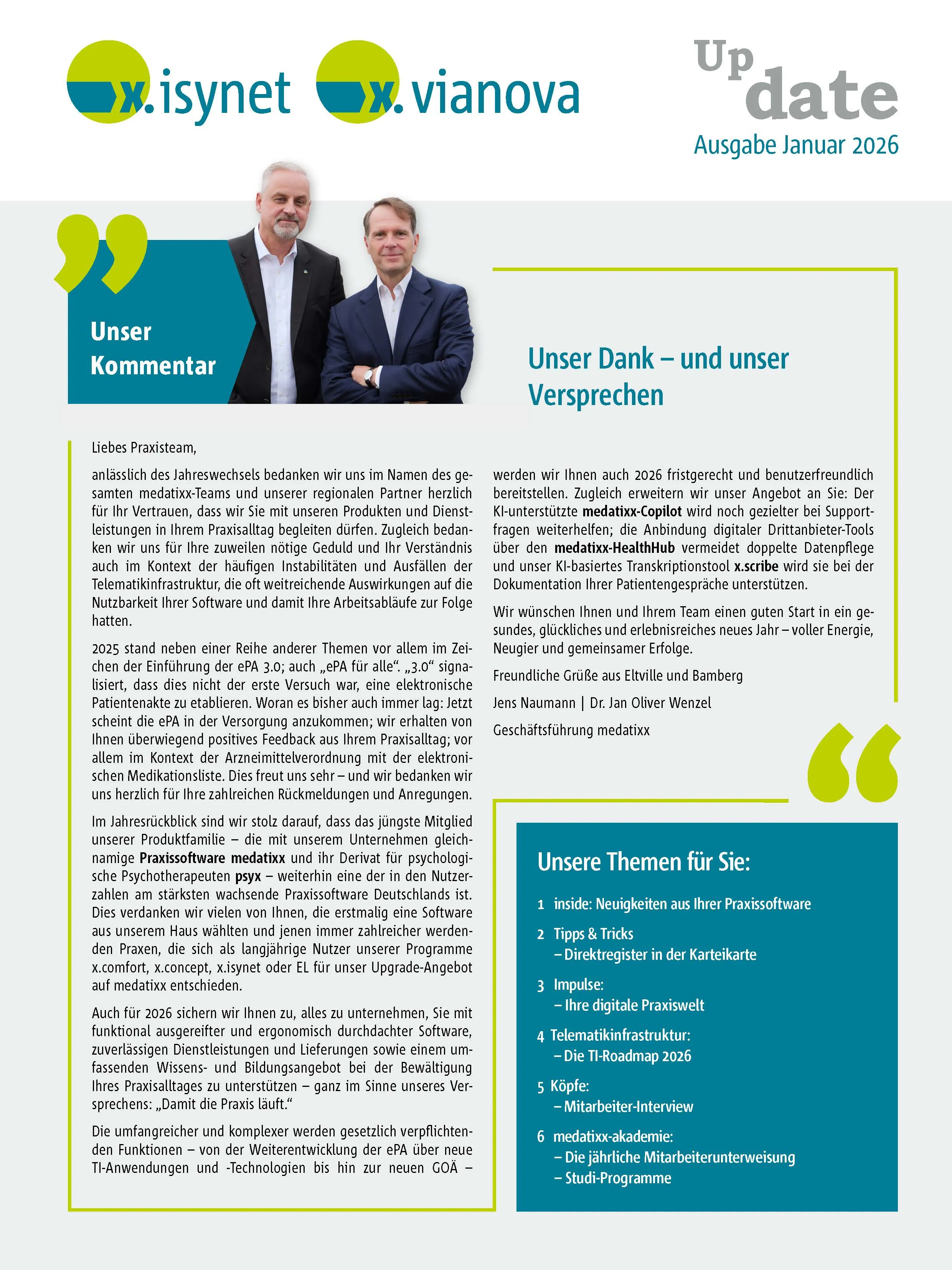 Die neueste Ausgabe unseres x.press-Updates ist da! Wir informieren Sie über aktuelle Neuigkeiten aus Ihrer Praxissoftware, geben Ihnen einen Überblick über die TI-Roadmap 2026 und stellen Ihnen aktuelle Angebote unserer medatixx-akademie vor.